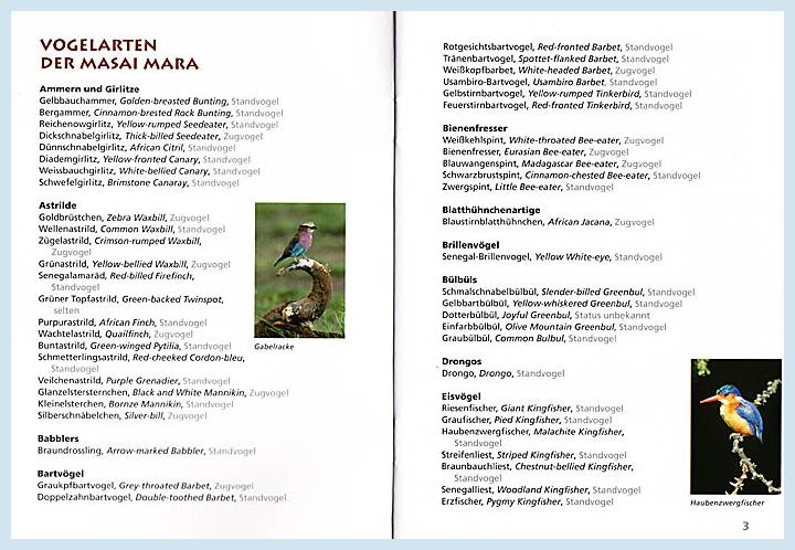 die eine Liste aller Vogelarten der Masai Mara enthält, mit deutschen und
