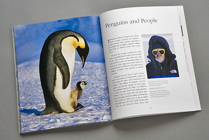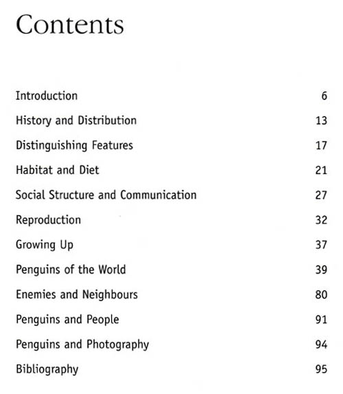 There are seventeen different species of penguins in the world all of which live by or near the sea. Most live on the coast of Antarctica and some in warmer places on the coast of South America, Africa, Australia and New Zealand. Although each species is slightly different they cannot fly as their wings are adapted for life in the water. The Emperor penguins are the largest of the species at about a metre tall and weighing 35 kilograms. The smallest are the Little Blue or Fairy penguins at around 40 centimetres, weighing as little as 1 kilogram. They have a lifespan of up to fifteen years with the largest species living up to twenty five years. Penguins are sociable creatures spending much of their time together with other members of the same species forming colonies to breed in what is known as rookeries. Colonies vary in size and can have from 500 to 50,000 penguins in them. Penguins face many dangers while at sea from ocean predators like leopard seals, sea lions, sharks and killer whales who eat them für food, and on land rodents, foxes and birds steal their eggs. In the past there were more species of penguins and today some are endangered. Apart from natural predators, humans are equally responsible for the decline in some species and conservation groups are working protect them. Fritz Pölking has spent much time in Antarctica and in the book he illustrates with wonderful photographs the various species and their habitat. |