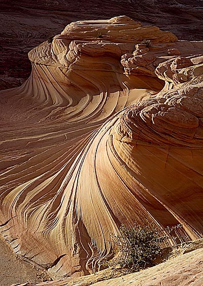 Brennweite 54 mm), Es hatte also so eben noch geklappt mit dem Foto vor Sonnenuntergang. Was mir nicht so ganz behagte war, dass ich jetzt im Schein der Taschenlampe 2-3 Stunden in der Dunkelheit zurücklaufen musste um den Parkplatz am Wire Pass zu finden. Aber der Tag brachte noch zusätzliche interessante Erlebnisse, wobei die Dinge am Rande, die man als Naturfotograf so erlebt, eigentlich ein eigenes Buch wert wären. Hier mal drei (oder vier bis fünf) Erlebnisse nur von diesem einen Tag, wie man sie draußen oft erlebt: 1: Während ich auf dem Weg vom Wire Pass, wo man sein Auto abstellen muss um die restlichen gut 3 Meilen zu Fuß zur Wave zu gehen, nach einer halben Stunde die erste Pause machte, überholte mich mit Schwung ein Belgier (jung, dynamisch, erfolgreich), und als er vorbei war sah ich an seinem Fotorucksack links und rechts je eine große Thermoskanne hängen, wie man sie sonst benutzt um Mahlzeiten warm zu halten. Darin klimperte es bei jedem Schritt fröhlich vor sich hin – es waren Eiswürfel, damit die Getränke später an der Wave besser schmeckten. Diese Belgier haben wirklich Klasse und Stil.... 2: Während ich mich dann nach 1.5 Stunden der 2.Wave so langsam näherte, bewölkte sich der Himmel bedenklich und es sah so aus, als wäre mein ganzer Aufwand umsonst gewesen, denn die 2.Wave ohne Sonne, das Motiv hätte man 'In der Pfeife rauchen können'. Da begegnete mir ein Naturfotograf auf dem Rückweg von der 1.Wave der dort den ganzen Morgen fotografiert hatte. Er sagte mir, dass das Fotolicht wohl eben im verschwinden begriffen wäre, um machte dabei einen Gesichtausdruck, als wenn es für einen Naturfotografen nichts Schöneres gäbe als zu sehen, dass ein anderer Naturfotograf zwei Stunden völlig umsonst durch 34 Grad Hitze gelaufen ist.... Schadenfreude scheint immer noch die reinste aller Freuden zu sein... Glücklicherweise irrte er sich und gegen 18.00 Uhr waren die Wolken verschwunden und ich konnte meine geplanten Bilder machen. 3: Etwa fünf Meter neben mir hatte - an der 2. Wave angekommen - inzwischen der belgische Kollege eine teure 6x6 Rollei auf das Stativ gebaut und alleine gelassen, um in seinem Rucksack in 6-8 Meter Entfernung etwas zu suchen. Es war zwar völlige Windstille, aber mir drehte sich der Magen um als ich die Kamera da alleine auf dem Stativ stehen sah, weil ich aus früheren Besuchen der Wave wusste, das hier plötzlich heftige Windstöße kommen. Im letzten Jahre hatte so ein Windstoß das Stativ meiner Frau umgeworfen, und der Kugelkopf ihr eine ziemlich schlimme Platzwunde am Kopf verursacht, die heftig blutete. Ich bat den Belgier also, doch sofort seinen Fotorucksack als Stütze an das Stativ zu lehnen, und hier in dieser Gegend sich niemals auch nur einen Meter von der Kamera auf dem Stativ zu entfernen. Wenn er sich entfernte, sollte er die Kamera vorher abnehmen, oder das Stativ auf den Boden legen mit der Kamera. Zehn Minuten später kam so ein heftiger Windstoß, dass auch meine Kamera mit dem Stativ umfallen wollte und ich sie schnell festhalten mußte, trotzdem ich den Rucksack dagegen als Abstützung gestellt hatte. Unsere beiden Hüte flogen etwa 2o Meter im hohen Bogen durch den Wind, und ohne meinen Hinweis wäre die schöne 5.000,- Euro 6x6 Rollei des Kollegen wohl Schrott gewesen. Also ein sehr erfolgreicher Tag: Erstens die Aufnahme bekommen und gleichzeitig die gute Tat für den Monat Juni begangen – was kann man mehr von einem Tag erwarten? Dieses Gebiet, die Paria Canyon Wilderness, zwischen Page und Kanab gelegen, ist eine wirkliche Wildnis: es ist kein Nationalpark mit Hinweisschildern, Wegen und Picknickplätzen. Wer hier schlecht vorbereitet ist ,kann böse enden..'. Zwei Beispiele aus diesem Jahr: 4: Im März saß ich nach getaner Fotoarbeit am Rande der 1.Wave und meditierte - Sie kennen das sicher -, über so wichtige Dinge wie den Sinn des Lebens und so weiter... Da hörte ich plötzlich eine Frau immer wieder mit Panik in der Stimme laut rufen. Sie hatte vorher zwei Stunden in der Wave fotografiert, wollte dann die Umgebung erkunden, hatte kein GPS bei sich und plötzlich völlig die Orientierung verloren, um durch Zufall und Glück wieder zur Gegend um die Wave zu finden wo ich sie hörte und ihr helfen konnte. Man muss dazu wissen: Wenn man von der Wave aus in der falschen Richtung weitergeht, dauert es fünf Tage, bis man wieder auf eine Strasse stößt. Und fünf Tage in der Wildnis, ohne Wasser...? 5: Jetzt im Juni sahen drei amerikanische Fotografen, die eine halbe Stunde vor mir den Rückweg angetreten hatten, plötzlich etwa eine Stunde von der Wave entfernt ein einsames Stativ stehen und einen Mann, der sich – große Kreise drehend – immer weiter davon entfernte. Er hatte viel zu wenig Wasser mitgenommen und befand sich jetzt am Rande des Deliriums – und das bei Anbruch der Dunkelheit. Was wäre passiert, wenn die drei ihn nicht noch so eben vor Tagesende entdeckt hätte...? Wenn Sie also in der echten Wildnis fotografieren wollen: Immer ausreichend Wasser mitnehmen, möglichst GPS mitnehmen und immer sehr, sehr sorgfältig planen... * * * * *