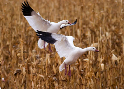 Was tun sprach Zeus? Mitte Dezember stand ich im Bosco del Apache Wildlife Refuge in Neu-Mexiko und wollte Schneegänse fotografieren. Vor mir auf einem abgeernteten Kornfeld fraßen etwa 3000 Schneegänse und ich wartete, bis sie mal auffliegen würden. Das passiert meistens so jede Stunde einmal. Wenn eine Gans einen Warnschrei ausstößt, wenn ein Kojote kommt, oder auch aus Gründen, die man als Mensch nicht erkennen kann. Die Canon EOS 5 D mit 12.8 Megapixel und Vollformatsensor stand vor mir auf dem Stativ, fertig eingestellt für den Moment, an dem der große Gänseschwarm auffliegen würde. Da es aber etwas langweilig ist, eine Stunde hinter dem Stativ zu stehen und auf einen Moment zu warten der da kommen soll, hatte ich das Reservegehäuse (EOS 10 D mit 6.3 Megapixel und Halbformatsensor) mit einem 5.6/400 mm Tele bestückt und machte jetzt Aufnahmen der an- und abfliegenden Einzelvögel, oder der kleinen Gruppen von 2-5 Schneegänsen, die immer wieder mal kamen oder abflogen.