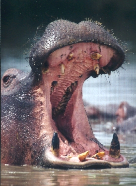 So ab und an hat man das Glück, einem besonderen Individuum in der Tierwelt zu begegnen, oder besonders günstige Umstände anzutreffen, die spezielle Aufnahmen ermöglichen. So hatte ich schon oft Flußpferde fotografiert, und immer hatte ich mich über die Perspektive geärgert. Schräg von oben aufgenommen, verloren die Bilder automatisch viel von ihrer Wucht und Dynamik. Als ich auf dem Weg zum Gombe Nationalpark in Tanzania war, wo ich Schimpanzen fotografieren wollte, machte ich einige Tage Station im Serengeti Nationalpark. und entdeckte dort vor der Seronera Lodge einen idealen Platz um Flußpferde aufzunehmen. Dort war ein Fluß etwas gestaut worden, durch eine kleine Mauer, an der direkt ein Weg vorbeiführte. Dadurch war man im Auto sitzend fast in Höhe des Wasserspiegels, und konnte so die Flußpferde praktisch Auge in Auge fotografieren. Das ergab endlich die schon lange gewünschten Flußpferdebilder, die diese Tiere so wuchtig und eindrucksvoll zeigten, wie ich es mir immer schon gewünscht hatte. Nikon F5, 4.0/500 mm, Sensia-100, Autoscheibenstativ