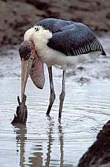 Gegengeschäfte.. Wenn die Regenzeit im Musiara-Sumpf in Kenias Masai Mara Wildreservat zu Ende geht, und die große Trockenzeit beginnt, müssen die Fische aufpassen und eine tiefe Wasserstelle finden, wenn sie überleben wollen. Eine Gruppe von etwa 30 Welsen hatte dies verpaßt, und war in einer kleinen Wasserlache gefangen, die von Tag zu Tag mehr austrocknete. Fast immer wenn ich die Stelle kontrollierte, standen dort 4 - 6 Marabus und 1 -2 Schreiseeadler (African Fish Eagle) um den Tümpel herum. Die Marabus konnten die Fische nicht herunterschlucken, dafür waren sie wohl zu groß. Aufspießen und öffnen konnten sie die Welse anscheinend auch nicht. So wiederholte sich manchmal folgender Vorgang: Die Marabus "machten mit einem Wels so lange herum", bis er tot war. Dann zogen sie ihn an Land, wo sie sich ihn "widerstandslos" von einem Adler abnehmen ließen. Der öffnete den Fisch und fraß ihn zum großen Teil, bevor er abflog. Dann kam erst ein Hammerkopf, der die Fischstückchen im Umkreis von 20 - 30 cm aufpickte, die dem Adler von der Beute weggespritzt waren, wenn er am Fisch gezogen hatte, um Teile aus der Beute herauszureißen. Danach kam dann vorsichtig der Marabu zurück, und der Kreis war geschlossen. |