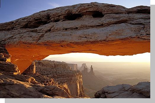 | Dieser wundervolle Naturbogen ist schon häufig fotografiert worden, aber immer wieder schön anzusehen. Das einzige Unangenehme an diesem Bild ist, das man dafür schon vor 5.oo Uhr am Morgen aufstehen muss, damit man rechtzeitig vor Sonnenaufgang an dieser Stelle des Canyonlands Nationalparks eintrifft. Dann hat man etwa 20-30 Minuten Zeit, so ein Bild aufzunehmen - vorausgesetzt, es gibt an dem Morgen einen Sonnenaufgang.. (Immer an Dr. Murphy denken). |