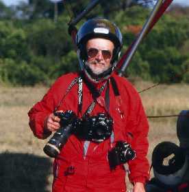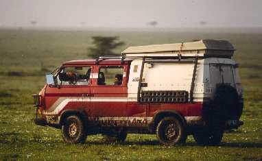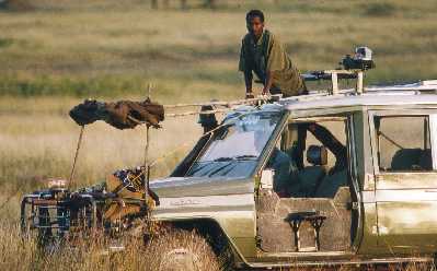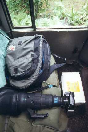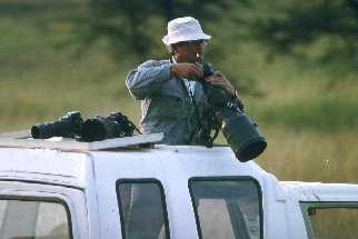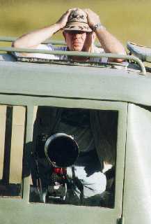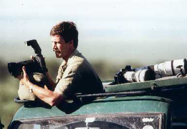 This is a funny picture and looks a lot more like a manic photographer instead of a Wildlife Photographer. Tom Brakefield took this picture of me just before I started off in the Ultra Light Craft. The more serious aspect of this is, that you had better not change your roll of film while in the air because the lawn mower propeller is situated directly behind your back and if a strong gust of wind happens to tear one of your film cases loose and it flies into the propeller, it certainly would not be very funny. So in order not to have to land every ten minutes to change your film, it is advisable to carry several cameras around your neck. These here are equipped with focal lengths of 2,8/24 mm, 2,8/55 mm, and 2,8/70-210mm. I was able to gather best results with these while in the sky above the Masai Mara : 24 mm for wide range, 55 mm for most and in turn the best scenic pictures, and 70-210 mm for wildlife shots. In combination with an open aperture and automatic timer, so that the camera uses the shortest possible shutter speed. The Ultra Light Craft is extremely suitable for aerial photos because of the slow speed with which it flies and you donīt have a window pane between subject and camera. 90% of my pictures are taken through an opening in the car door, because that angle provides a better perspective from below and turns out better pictures. Sometimes you do have to take the pictures through the sunroof of the car, simply because the radius from below is not wide enough for the camera to follow the cheetah on her hunt or the grass is too tall, and every time when a Leopard is lying in a tree or on a rock, in order to avoid a photo perspective that is too steep. Since the sandbag is only a quick improvisation in the composition of wildlife photography, I brought a board with me for situations when you have a bit more time and mounted it in front of me across the sunroof in order to place two rotating heads on it. With this you can always have two focal lengths fixed on one spot and sometimes you really gain valuable seconds, because you have to readjust the two lenses when they are mounted on sandbags. Many of todays reflex cameras have auto focus and/or an electronic adjustment support. This works in a way, so that with a 100% focus you see a green or black spot in the seeker which gives you the signal that the focus is now set perfectly. These two technical supports are priceless and extremely important for me while taking pictures at nighttime. In the light of the spotlight or from the flashlight I can certainly make out the subject, but it is impossible for me to manually focus exactly with these remnants of light. Further difficulties provide the fact, that you should not use white adjustment light, since it irritates the animals, but rather a red light to which they usually do not react at all. To adjust the focus in this red light is even more difficult. Since I was not especially satisfied with the light of the normal flashlights and not with the strong flashlights that are supposed to have a beam which reaches up to 1.000 meters either, I went and bought a lamp especially designed for hunters from Kettner for DM 39,50 that can be attached to the cigarette lighter of your car and taped red foil over it. The result was fantastic: at a distance of 20-30 meters outside in the darkness you can still work with an auto focus and photographing Africaīs Wildlife in the dark turns into pure pleasure. Here on this picture you can see the equipment for my work in the dark: the camera has a SB-24 Flash, that is sufficient for the reflector setting of 85 mm, with a 200 ISO film up to about 15-20 meters distance, depending how bright it is and the aperture (with an aperture of 5,6 10m, an aperture of 4,0 15m and with 2,8 up to about 20m). I use this rather small flash because it doesīnt burden the equipment so much and you donīt have to make so many modifications on the vehicle. If you specialize in night photography it is advisable to use a stronger Metz flash rod. On the left side on the photograph above, you see the spotlight with the red foil. It is always fascinating for me to see just how fast and exact the auto focus works in the dark with just a little red light when I have difficulties discerning the desired object in the dark seeker. Paradise, the Leopard is lying in front of my vehicle and is just dozing. This is a twofold, odd, fascinating and somewhat uncomfortable situation: on one side of course I am absolutely rapturous to have this fully grown wild Leopard come down from her tree of rest and lie down next to my car. It is so fascinating to see such great feline from such a close distance. Unfortunately it is pointless from a photographic point of view because the angle is too steep and the background too restless.... This is a little problematic since there is a rule that says you should not get closer than 20 meters to one of the large cats. Well now, I did not go to her, but the cat came to me and probably wanted to use the vehicle as cover, but the tourists and rangers that come by later wouldīnt know that. For them it would just look like a wildlife photographer tried to get as close as possible to Paradise, and is crowding her private sphere. That is the reason why I always put more distance than what the feline may herself want, between us, whenever I heard that other vehicles were approaching, in order not to give the wrong impression. Dr. Horst Hagen, one of the greatest authorities of the wildlife of Eastern Africa, who has written numerous books about this fascinating world and whom you can encounter very frequently in Africa. Here he is taking pictures of "my" Leopard. This is the vehicle of a British film maker. You can tell professional film makers by their vehicles. They replace the passenger door with a boarded gate on which the support for the heavy movie camera is mounted and hang outside of the vehicle. This one has a third possible alternative (a c