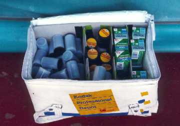 Here you can see Jonathan Scott in full action. He more or less is living in the Mara half the time and the other half he spends with his family in Nairobi. He has published numerous fantastic books about the animals of the Masai Mara and the Serengeti and he is also one of the few "Triple Talents": he can take pictures, write and draw. Such a Kodak film cooler is with me at all times in the vehicle, placed on the floor next to my seat. To the left the Fujichorme Sensia -100 films for almost all takes. In the center the red Kodachrome-200, for the "blue hours" either very early or very late. Since the K-200 has a bit of a brown tint it is very suitable for taking pictures with too much of a blue color balance like before sunrise or during rainy weather in order to even the colors out a bit. Next to that, all the way to the right, the Fujichrome-400 slide films, for absolutely hopeless situations where light is concerned. The color situation of the 400 slide films is catastrophically bad and one should only use them when it is extremely necessary. * * *