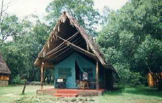 "My" tent in the Mara-River Camp. Above the bed, my own private mosquito net. The Masai Mara is situated rather high for mosquitoes and I did not see many of them. But sleeping under the net (which you should always take with you to Africa) is much more comforting, since a case Malaria is not really the ideal souvenir to bring with home with you from Africa. The Mara River Camp is closed since 2002. * * *
