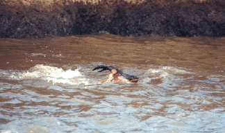 October 12th, 1993 Many think, good wildlife photography in Africa is simple, because the animals hardly have an escape distance. Especially Cheetahs are no problem, since they cant hide in the savanna. Today we left the Cheetah mother with her 4 young at 12 oclock during the noon heat lying in the shade under a tree, certain that we would find them again at 3pm when we returned. When we came back at 3pm they were gone. Only wide open savanna in a 5 km radius and still they were not to be found. We ended up looking for the 5 Cheetahs with all of 11 cars, all from the surrounding camps and they all had native drivers who knew every tree, every rock and every animal there. At 5pm two hours later - we finally discovered them, because one of the young cheetahs had lifted its head above the only 20 cm tall grass. To clear up the mystery: Between noon and 3pm, while all the vehicles were at their respective camps, the Cheetah captured a Thompson Gazelle who had been just a little too lighthearted. The five had eaten their fill and when the vehicles returned at 3pm for the afternoon tour, all 5 were lying flat in the savanna fast asleep so that not even the 30-40 passengers of the 11 vehicles equipped with binoculars were able to spot them in spite of the open landscape and the certainty that a mother with 4 very young kids would not be able to travel far in the searing heat. So much for the "easy" Cheetahs. If you have a stealthy and careful Leopard who is lying on a rock, move 2 Meters off to the side into the grass or into a ditch, you wont find him again if he doesnt want you to. You can have 100 cars.... That is the reason why there are so few really good pictures of an active Leopard. Most pictures show the Leopard lazily reclining in a tree by himself or with his prey, since this is the only acceptable picture of a Leopard that can be taken relatively easy with the least amount of time and mental expenditure. Insanity When you get to talking to people while traveling or in camps and you answer the question as to what your profession is with "Wildlife Photographer", then most people get a rapturous expression on their face, glassy eyes and the sentence that invariably comes is: "Oh, I am so envious." That is why I took one of the 12 acts of the "Masai Mara A Jewel of Africa" opera and analyzed it to a point of why this profession is so fascinating for people: The first tour for this photo project took 3 weeks, from September 27th until October 19th. All of 20 hours of that time I sat in airplanes and 14 hours of that time I was waiting for airplanes. 21 times 8 hours I was lying in bed and 20 times 12 hours I sat in my Toyota Landcruiser. A day in the life of a wildlife photographer looks about like this: you get up at 5 am and you sit on a hard, uncomfortable and badly cushioned car seat from 5.30am until 6 or 7pm and get transported over permanently miserable roads. Sitting, sitting.......in the evening of course you sit again at dinner and the only exercise the wildlife photographer in Africa gets with his own two feet are the two daily trips of approximately 5 seconds that it takes to drag himself from the bed to the toilette where he naturally sits again. This way you come to about 7 minutes of exercise in three weeks. The remaining 503 hours and 53 minutes you spend sitting in a Land Rover, waiting that in front of you the wonders of nature will open, sitting or lying in the lodge or sitting on the way to the airport, at the airport or in the plane. Additionally as a bonus while sitting in the gate you get this friendly voice through the intercom telling you " the departure of your flight is slightly delayed because the arrival of the plane was/is late" (Just exactly why the arrival of your plane is late you never find out.....apparently that isīnt any of the passengers business) or because there has been a minor technical difficulty but because of safety reasons, the spare part will be flown in and is actually already under way. In the meantime there will be paid by the airline of course (question of honor) a warm meal at the airport restaurant (meaning the delay will at least be 5-7 hours) but thats no problem....... at least youll be sitting. So while you endure the delay before you start on your 8-10 hour flight and get to talking to people and you answer the question as to what your profession is with "Wildlife Photographer", then most people get a ............. Having arrived back at home you sit again: first at least a week in front of the fluoroscope in order view the 200 developed rolls of film from the tour = 7.000 slides to evaluate, 6.000 of which you throw away. The remaining 1.000 will be defined, labeled, stamped, sent off or put into the archive. So in the second week you sit at your desk to check the mail from the past 4 weeks and if you have accomplished that, you can get up........but only to drive to the airport for the next round of sitting. My wife keeps wondering why my shoes last so long, but my pants are so worn through...... October 14th, 1993 Beautiful morning or..... all of theory is gray! In the evening just about 6.30pm we had discovered the Leopard lady again and of course were there again very early the next day. Towards 7am she made an attempt at hunting 10 Thomson Gazelles and had crept up to about 5 meters. Ready to shoot with a roll of fresh film I awaited her attack. Unfortunately she was disturbed by two Lions and one Masai and fled up a tall tree where it seemed she was going to stay for the duration of the morning. So we drove the 45 minutes to the Cheetah mother with her 4 babies just to find out that she had slain an Impala a few minutes before our arrival. So there was nothing there for us either. The continuation of our trip brought the "gratifying" news from one of the colleagues, that about 10 minutes ago a herd of approximately 80 Thomson Gazelles crossed the river and that the great three-legged Crocodile "Tripod" caught one of the Th
