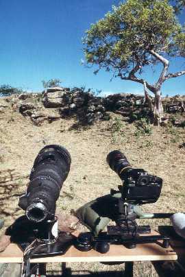Viele Spiegelreflex-Kameras haben heute Autofokus und/oder eine elektronische Einstellhilfe. Diese arbeitet so, daß bei hundertprozentig korrekter Scharfeinstellung im Suchereinblick ein grüner oder schwarzer Punkt erscheint und signalisiert, daß jetzt die Schärfe absolut richtig eingestellt ist. Diese beiden technischen Hilfsmittel sind für mich unbezahlbar wichtig bei Nachtaufnahmen; denn ich kann zwar im Scheinwerfer oder Taschenlampenlicht das Motiv erkennen, aber es ist mir völlig unmöglich, manuell bei diesem 'Restlicht' korrekt zu fokussieren. Erschwerend kommt noch hinzu, daß man kein weißes Einstellicht nehmen sollte, weil dies die Tiere oft irritiert, sondern besser Rotlicht, weil sie darauf meistens nicht reagieren. Aber auf Rotlicht einzustellen, ist noch schwieriger. Weil ich mit dem Lichtstrahl von Taschenlampen als Einstellhilfe nicht sonderlich zufrieden war - auch nicht mit den starken Stablampen, die angeblich bis 1.000 rn reichen - kaufte ich bei Kettner für DM 39,50 eine Lampe für Jäger, die man am Zigarettenanzünder des Autos anschließen kann, und beklebte sie mit einer roten Folie. Das Ergebnis war großartig: auf 20 -30 rn Entfernung kann man damit draußen bei Dunkelheit sogar noch mit Autofokus arbeiten, und die Fotografie von Afrikas Tierwelt in der Dunkelheit wurde zu einem reinen Vergnügen. Hier auf dem Bild sieht man meine Ausrüstung für die Arbeit in der Dunkelheit: Auf der Kamera ein SB-24 Blitz, der bei Reflektorstellung auf 85 mm und einem 200 ISO-Film bis etwa 15-20 m reicht, je nach Objekthelligkeit und Blende (bei Blende 5,6 10 rn, bei B. 4.0 15 rn und bei 2,8 bis etwa 20 rn). Diesen relativ schwachen Blitz nehme ich, weil er die Ausrüstung nicht sonderlich belastet, und auch keine besonderen Umbauten im Fahrzeug erforderlich macht. Wenn man gezielt sich auf Nachtfotos spezialisiert, ist sicher ein stärkerer Metz Stabblitz zu empfehlen. Links neben der Kamera sieht man den mit roter Folie beklebten Scheinwerfer. Es ist für mich immer wieder faszinierend zu beobachten, wie schnell und exakt Autofokus in der Dunkelheit bei einem kleinen bißchen rotem Licht noch scharfstellt, wo ich schon faßt Mühe habe, daß Objekt der Begierde überhaupt im dunklen Sucher noch zu finden.