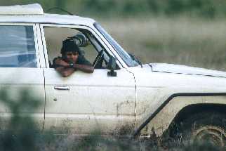 Hier der Wagen eines britischen Filmers. Berufsfilmer erkennt man oft daran, daß sie die Fahrertür aushängen und durch eine Brettertür ersetzen, an der eine Halterung für die schwere Filmkamera angebracht ist. Dieser hier hat als dritte Möglichkeit noch vorne über der Kühlerhaube ein Tarngestänge mit Stoff angebracht, wahrscheinlich um von da aus herunterhängend über die Haube Filmszenen aus Bodenhöhe drehen zu können.