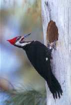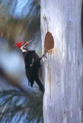 The Pileated woodpecker had his offspring toward the middle of April 2000 in a hollow about 8 meters off the ground in an Australian pine tree. This pine was located almost directly next to a road on the island of Sanibel in south western Florida. Therefore I was only able to take pictures from the other side of the road , where the telemeter of the lens indicated an exact 20 meter distance.