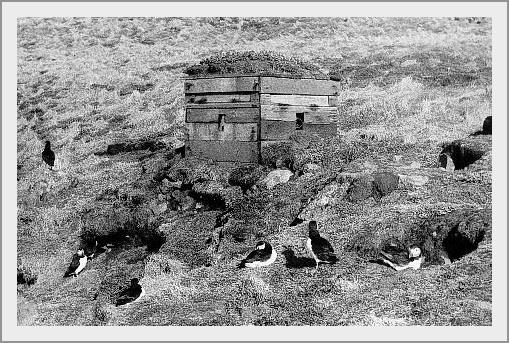 Dorthin hatte ich mich mit einer Nußschale übersetzen lassen, um für einige Wochen Papageitaucher zu fotografieren - in Schwarzweiß und mit der Linhof Technika und den Objektiven Schneider Xenar 3.5/105 mm und dem Voigtländer Telomar 5.5/240 mm, und einem 6x9 cm Rollfilmrückteil für die Kamera. Dadurch brauchte ich keine einzelnen Planfilme in Kassetten, sondern konnte 8 Fotos pro Film belichten.
