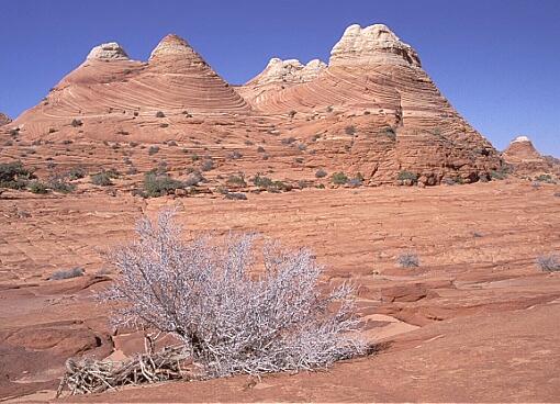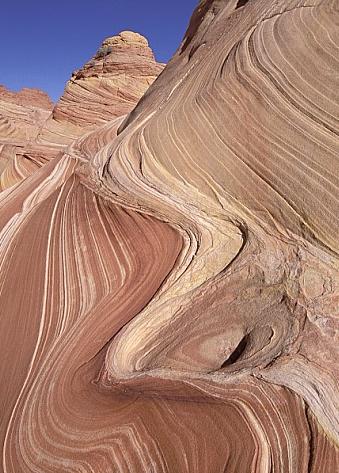 machte ich mich mit der Postkarte auf zum Wo genau wusste man auch nicht, es sollte aber im Paria-Canyon-Vermillion-Cliffs-Wilderness-Area liegen, welches zum Grand-Staircase-Escalante Nationalmonument gehört. Einem riesigen Schutzgebiet, größer als der Yellowstone Nationalpark, und 10x größer als der Zion- oder Arches Nationalpark, und von dem in Deutschland noch kaum jemand etwas gehört hat. Am besten sollte ich in der Rangerstation zwischen Page und Kanab nachfragen, die dortigen Ranger könnten mir sicher sagen wo das ist, und auch, wie ich dorthin komme. Auf der Rückseite der Postkarte stand: Vermillion Cliffs, situated at the mouth of the Paria Canyon. Die Rangerstation zwischen Page und Kanab fand ich auch. Aber leider war sie wegen mangelnder Touristen im Dezember 2002 geschlossen. Nach Rückkehr in Deutschland gab ich dann in eine Internet-Suchmaschine die Begriffe ‚Vermilion Cliffs‘ und ‚Coyote Buttes‘ und ‚Paria-Wilderness‘ ein, und siehe da: die Ergebnisse sprudelten nur so. Als Extrakt ergab sich, dass pro Tag nur zwanzig Besucher ein Permit bekommen, um ‚The Wave‘ besuchen zu dürfen – so hieß nämlich das Motiv meiner Postkarte - wie sich herausstellte. Man muss sich am Vortag ab 9.00 Uhr in der Rangerstation (wenn sie offen ist) zwischen Page und Kanab einfinden, und die ersten zehn bekommen ein Permit für den folgenden Tag. Wenn um 9.00 Uhr mehr als zehn Leute da sind, wird verlost. Weitere zehn können ein Permit 6 Monate vorher bekommen durch das Internet. Exakt 6 Monate im Voraus wird am ersten Tag des Monats um 12.oo Uhr die Leitung geöffnet, um man kann dann für einen gewünschten Tag (in 6 Monaten) eine Anfrage starten, und wenn man unter den 10 schnellsten ist, die sich nach 12.00 Uhr melden, bekommt man eine Genehmigung für den Tag. Da aber in sechs Monaten viel passieren kann, sind meistens nur die Hälfte der Permitinhaber da, und die anderen Genehmigungen werden nicht an Anwesende verlost, sondern verfallen einfach.. Ich hatte nun am 1. April 2003 um 12.00 Uhr Utahzeit versucht, für den 18. Oktober 2003 ein Permit für 2 Personen zu erhalten und auch Glück gehabt, schnell genug zu sein.