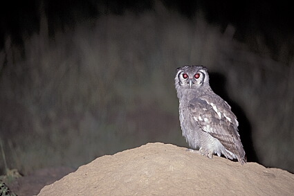 afternoon about Later on in the darkness we suddenly saw a desert lynx (caracal), but it was too shy and immediately disappeared into the night. The eagle owl, sitting on a termite hill on the other hand, gazing around with its big black eyes, let us take pictures for 20 minutes. He wasn’t disturbed by the infra red light, nor from the flash, showed no reaction at all and continued to search the surroundings for possible prey. That gave me the opportunity to take an extensive amount of pictures with a 1, 4 X converter in front of the 2, 8/300 mm AF-lens, vertical or horizontal format, centered or not, he just did not let anything bother him.