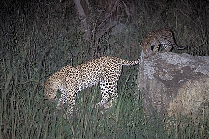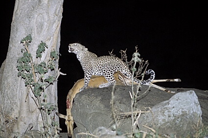 Zawadi is frolicking on the rocks behind her mother After the playtime which lasted about 30 min. mother leopard and her cub went up the opposite lying wall of rocks and disappeared a few minutes later into the darkness of the night. Unfortunately we were not able to follow the two in this type of terrain and in those types of situations I really wish one could transform the car into a silent helicopter. The first evening was a complete success: all the equipment functioned perfectly and the leopards were not disturbed by the infrared light nor by the flash. I made an additional pleasant discovery: When the leopard mom was lying down 10 meters away in front of our vehicle, I was shooting with the 2.8/300 mm lens and the Lepp Tele adapter in front of the Nikon flash SB-24. Through the support of the flash timer sequence reducer I ended up having so much power at my disposal that the time of the flash sequence was at under a second. I practically was able to snap pictures constantly without waiting for the flash to reload. April 19th: After the lady leopard had deposited her daughter in two different places in Leopard Gulch within 4 weeks she had now moved to somewhere without leaving a forwarding address and we were searching all day at all the possible locations without finding a trace of her. April 22nd This
