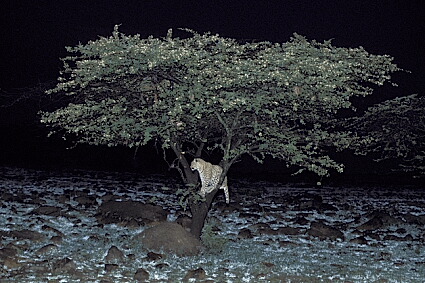 was about The mother seemed to be guarding the kill for the two little ones, because every time when the oldest daughter came too close to the tree with the impala, her mother growled at her in warning. This is how the situation stayed until I had to leave my observation post at dusk. Here in the wildlife reserve it is not allowed to be outside of the campground at night. So next morning I encountered the following scene: not one leopard left to be seen and the grown impala completely eaten, up to the skull and horns bearing witness to this feeding frenzy underneath the tree. Did the mother feed first or the oldest daughter? Or was it the two little ones and then the mother? Or maybe it was the mother together with the little ones and then the oldest daughter? Or, in the final analysis, was it all four leopards together that devoured the impala in or under the tree? I would have loved to have observed this with a camera and flash and I swore to myself that I would take night photos of leopards at the next possible opportunity. Something that is easier said then done. First of all you have to have leopards that you can find in one place with relative regularity. The best time for this is when a female leopard has cubs that are approximately 3-4 months old. For the time that they are smaller they are hidden in caves, ditches or in the thicket and when they are older and bigger then 3-4 months the mother is on the move with them far too much so that the youngsters get to know their homeland and the dangers in the life of a leopard. You waste too much time to try and find them anew each day. But at three to four months they are already pretty agile and could climb around on trees and rocks when mom was not around. Mom comes every day – or night – so that the cubs still get their milk. However all this is only theory – the nature photographer thinks, but the leopard acts. The opportunity came about two years after the in the beginning mentioned experience: Half Tail had had two new cubs on January 28th and about the middle of April I was there to take pictures of mom and her third litter of little cats – and this time at night as well, at least that was what I had planned. Unfortunately one of the two cubs had already died before my arrival. It was last seen the end of February at an age of about 4 weeks. No one knows the circumstances around its death, whether it was lions, hyenas or sickness. The surviving cub was a rather dark colored female and, just like her mother, not at all shy in any way. When I saw her for the first time on April 17th, shortly before sunset, she was peering nosily over the edge of a rock towards the car. She then climbed into a heavily foliaged tree as a hyena came wandering by, and that is where she stayed until complete darkness fell. We waited for while longer, but there was no sign of Half Tail.