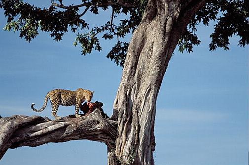Am Tage vorher hatte ich am Nachmittag in der Rhino Ridge einen männlichen Leoparden angetroffen, der ein etwa 10 Monate altes, und etwa 60 kg schweres Gnu erbeutet hatte. Er konnte es nicht auf einen Baum schaffen, und daher fraß er unter dem Baum so lange daran, bis es leicht genug war für den Transport nach oben auf den Feigenbaum. Am nächsten Tag fraß er dann oben weiter und nach 24 Stunden war praktisch nichts mehr von dem Gnu da bis auf ein paar Knochen, die dann für die Hyänen herunterfielen.
